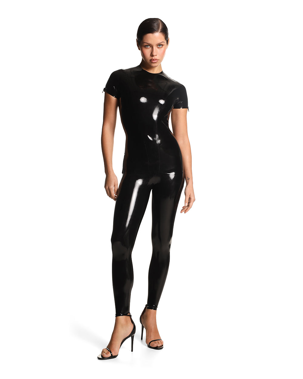 Базові легінси з латексу зі V-подібним поясом, що підкреслює талію. Виріб зручно вдягати завдяки невеликій товщині латексу (ви також можете скористатися спеціальним лубрикантом). Ідеально підходять для стилізації з корсетами Anoeses.
