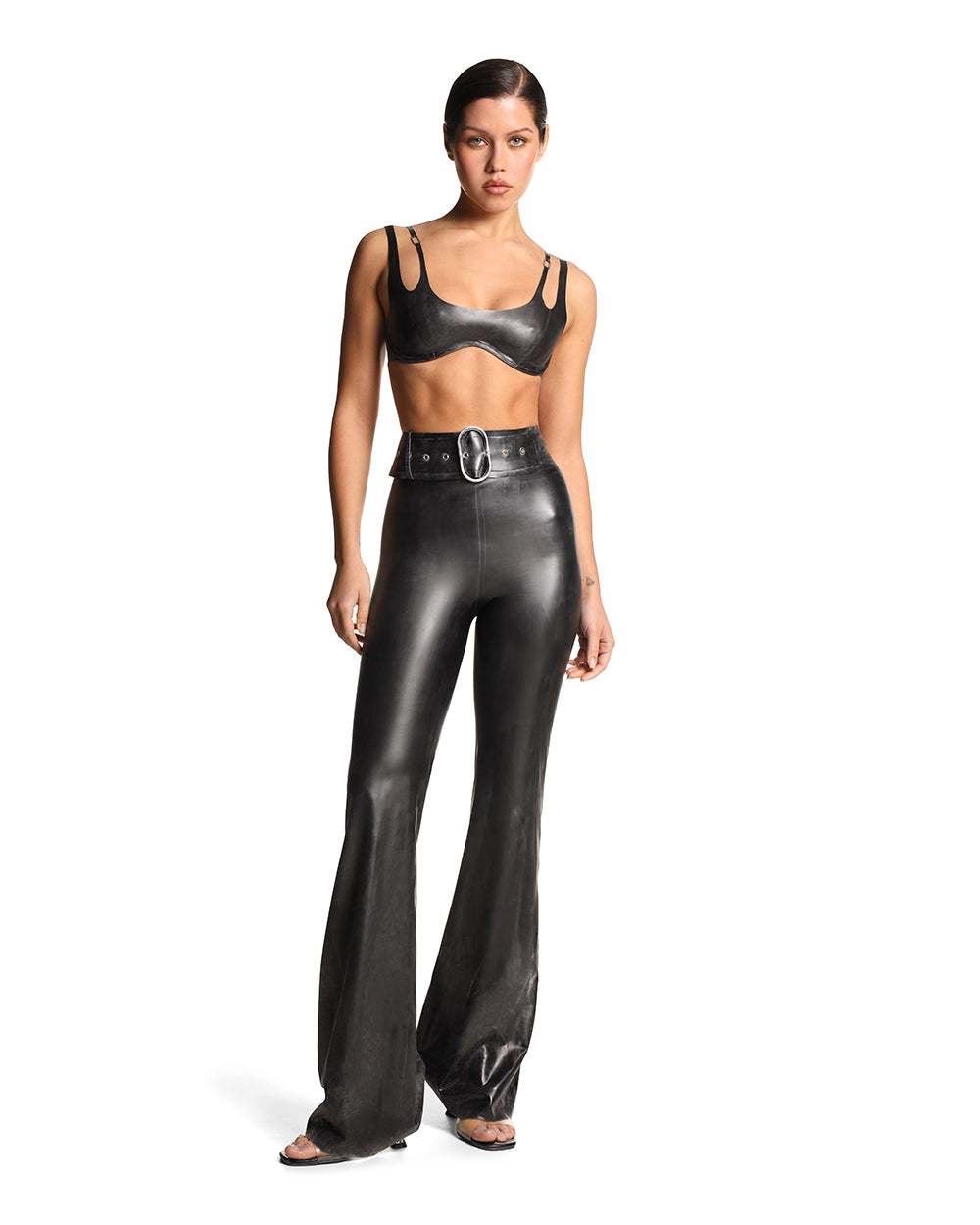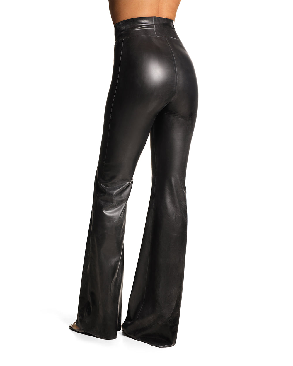 Штани кльош із високою талією виготовлені з латексу. Виріб зручно вдягати завдяки невеликій товщині матеріалу (ви також можете скористатися спеціальним лубрикантом). Додайте пояс із латексу для більш окресленого силуету. Стилізуйте з корсетами або латексними бра Anoeses.
